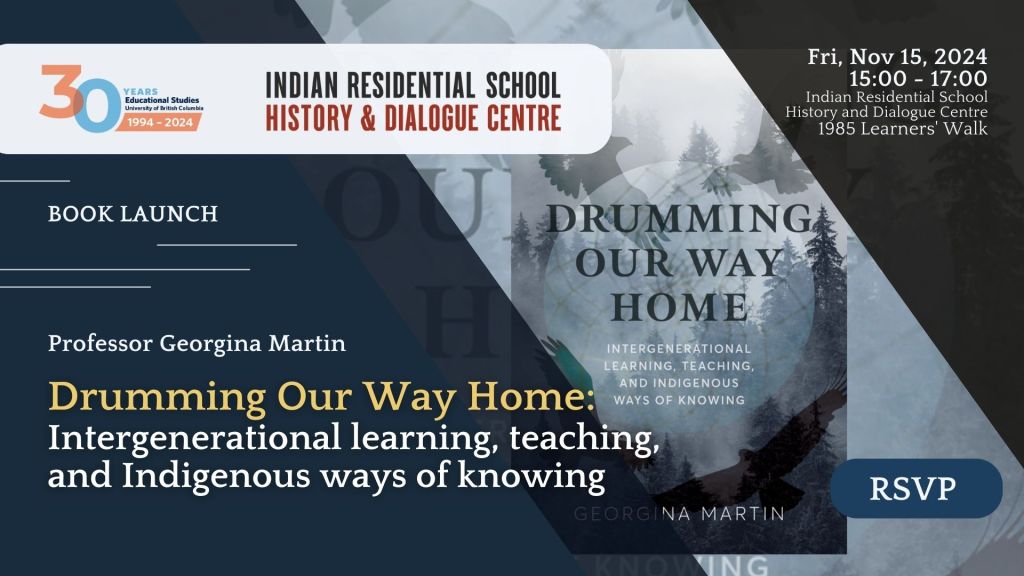 Notice: UBC Book Launch for Drumming Our Way Home: Intergenerational Learning, Teaching, and Indigenous Ways of Knowing on Friday, November 15, 2024, from 3:00 PM to 5:00 PM at the Indian Residential School History and Dialogue Centre, 1985 Learners’ Walk. More info here. All are welcome!