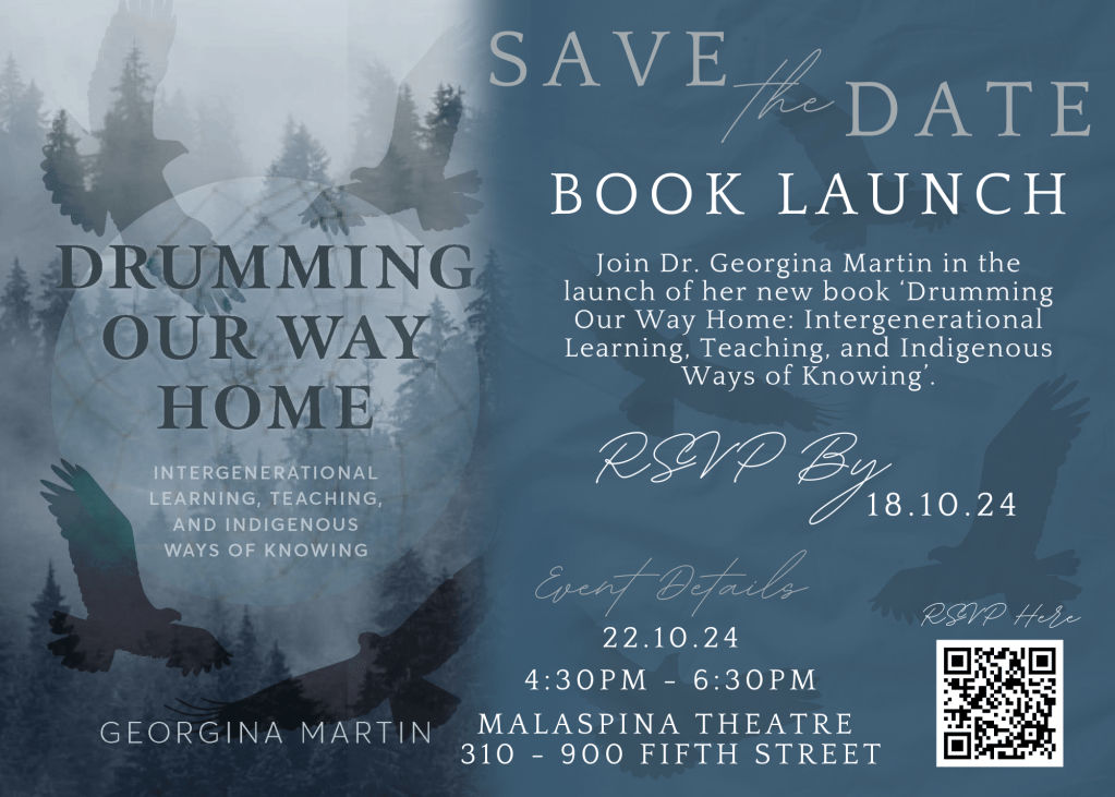 Notice: VIU Book Launch for Drumming Our Way Home: Intergenerational Learning, Teaching, and Indigenous Ways of Knowing on Tuesday, October 22, 2023, from 4:00 PM to 6:00 PM at Malaspina Theatre, 310-900 Fifth Street. More info here. All are welcome!